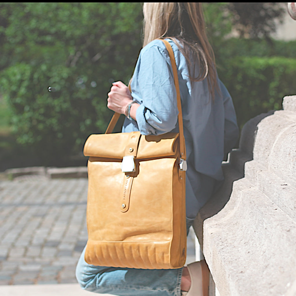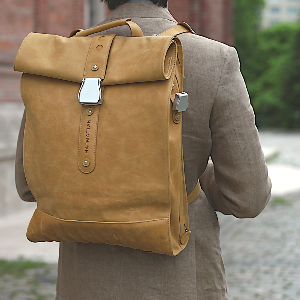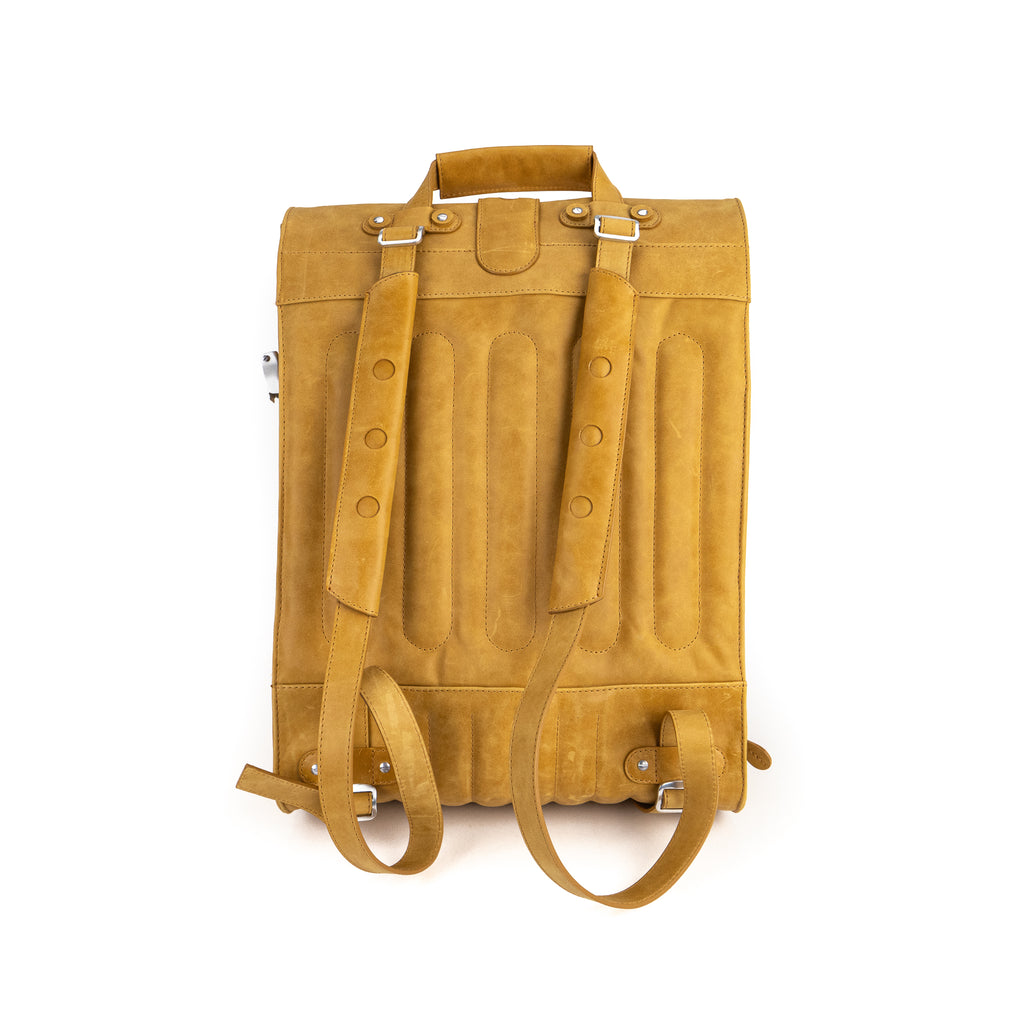 One of our most complex creations this backpack  does it all. You can wear it as a backpack or as a satchel. It features a roll top opening and lateral zipper access to the padded laptop dedicated pocket from the left or the right. The interior also features 3 different pockets of different sizes perfect for housing accessories.