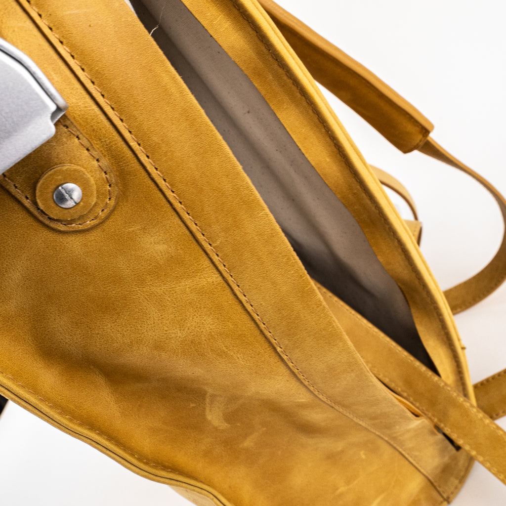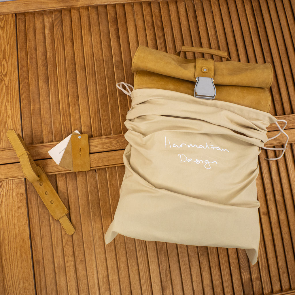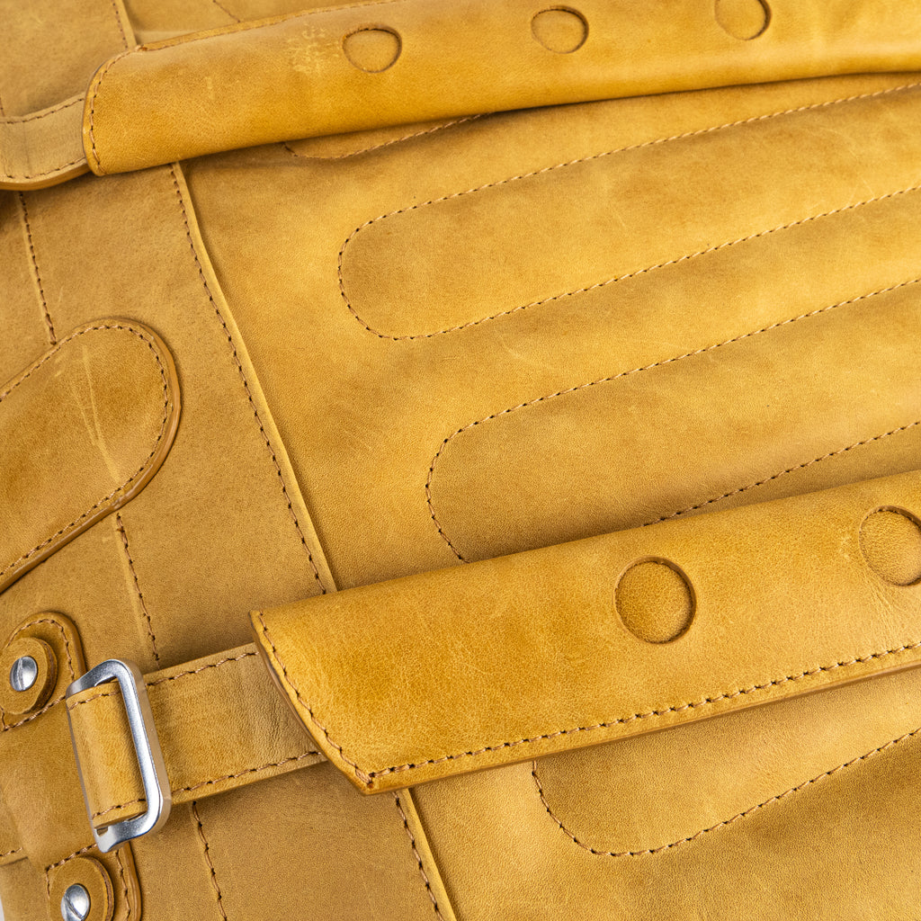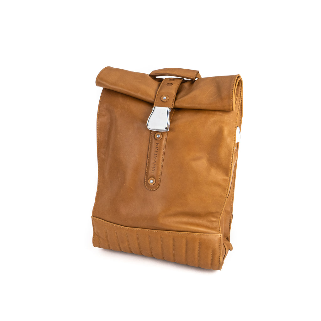 One of our most complex creations this backpack  does it all. You can wear it as a backpack or as a satchel. It features a roll top opening and lateral zipper access to the padded laptop dedicated pocket from the left or the right. The interior also features 3 different pockets of different sizes perfect for housing accessories.